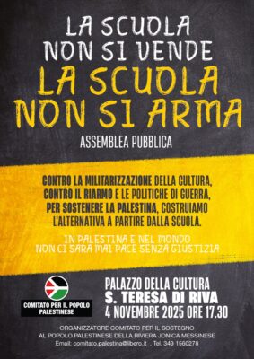 In un tempo in cui la scuola pubblica viene progressivamente svuotata del suo significato sociale e parallelamente indirizzata verso la cultura della guerra, il Circolo Rifondazione Comunista Lidia Menapace – Riviera Jonica Messinese sostiene con forza l’Assemblea pubblica organizzata dal Comitato per il sostegno al popolo palestinese, prevista per martedì 4 novembre presso il Palazzo … Leggi tutto