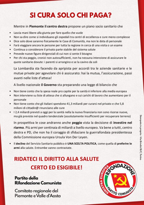 “In queste settimane – dice Alberto Deambrogio, segretario di Rifondazione Comunista del Piemonte e VdA – i cittadini e le cittadine piemontesi si trovano di fronte a una doppia negazione del loro diritto alla salute. La prima viene da ciò che è scritto nel nuovo Piano socio sanitario regionale, che forse vedrà la luce il … Leggi tutto