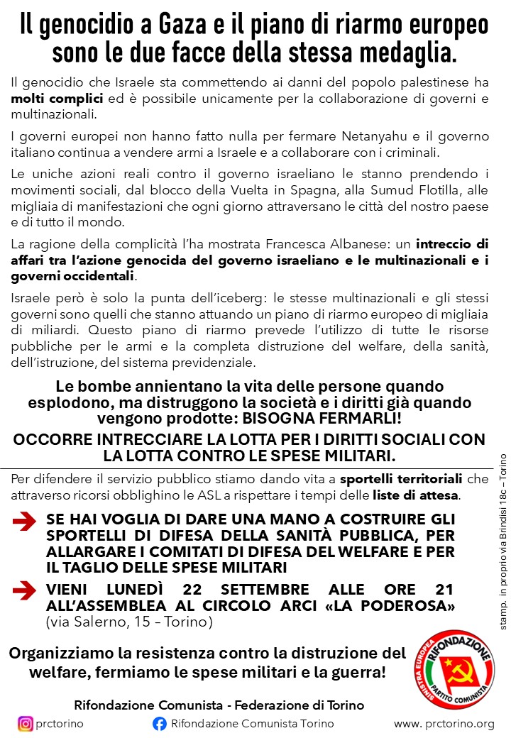 Il genocidio a Gaza e il piano di riarmo europeo sono due facce della stessa medaglia 22/09/2025 di Contributi Da Federazione PRC Torino Leggi il testo Condividi questo articolo: Facebook Telegram WhatsApp Mastodon TikTok VK Email