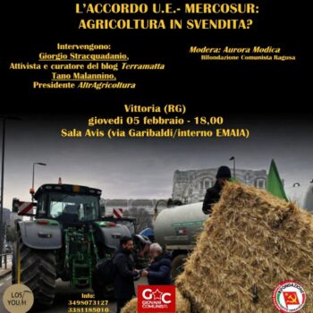 Giovedì 5 febbraio alle ore 18.00, nella Sala Avis di Vittoria, si terrà l’iniziativa pubblica “L’accordo U.E.–Mercosur: agricoltura in svendita?”, promossa da Giovani Comunisti/e, Rifondazione Comunista Siracusa–Ragusa e dal Movimento Lost Youth con gli interventi di Giorgio Stracquadanio e Tano Malannino e la moderazione di Aurora Modica, un appuntamento che giunge mentre il governo italiano e il PD continuano a sostenere un accordo che rischia di colpire al cuore l’agricoltura italiana e in particolare quella siciliana, già provata da anni di crisi, concorrenza sleale e politiche europee penalizzanti, motivo per cui anche la Sinistra Europea ha espresso in sede parlamentare un voto contrario netto al trattato denunciandone gli effetti distorsivi e il pericolo per le produzioni locali. In Sicilia, territorio più esposto all’impatto delle importazioni dal Mercosur, i comparti agrumicolo, orticolo, cerealicolo e vitivinicolo rischiano di essere travolti dall’ingresso di merci prodotte con costi del lavoro irrisori, standard ambientali e sanitari inferiori e l’impiego di sostanze vietate in Europa, una combinazione che trascinerebbe verso il basso i prezzi, il reddito agricolo e la sopravvivenza stessa delle aziende familiari, aprendo la strada alla desertificazione produttiva e all’abbandono delle campagne. In questo quadro appare evidente l’ipocrisia di chi celebra la cucina italiana come patrimonio UNESCO mentre favorisce l’arrivo di prodotti agricoli a basso costo che mettono in ginocchio le nostre filiere, senza portare alcun reale beneficio nemmeno agli agricoltori sudamericani, schiacciati dal potere dei grandi latifondi orientati all’esportazione. Per questo il 5 febbraio discuteremo insieme ad agricoltori e cittadini per difendere un’agricoltura di qualità e sostenibile, per difendere la nostra terra, il lavoro e il futuro delle comunità; per questo diciamo no al trattato UE-Mercosur e sì alla sicurezza alimentare, a una PAC equa, a un prezzo giusto per chi produce e per chi consuma, e rilanciamo un appello alla solidarietà tra agricoltori siciliani e sudamericani e ai consumatori affinché questa battaglia diventi la difesa collettiva della dignità, della sovranità alimentare e di un modello agricolo sano e giusto, capace di resistere alla logica liberista che sacrifica territori e persone sull’altare del profitto.