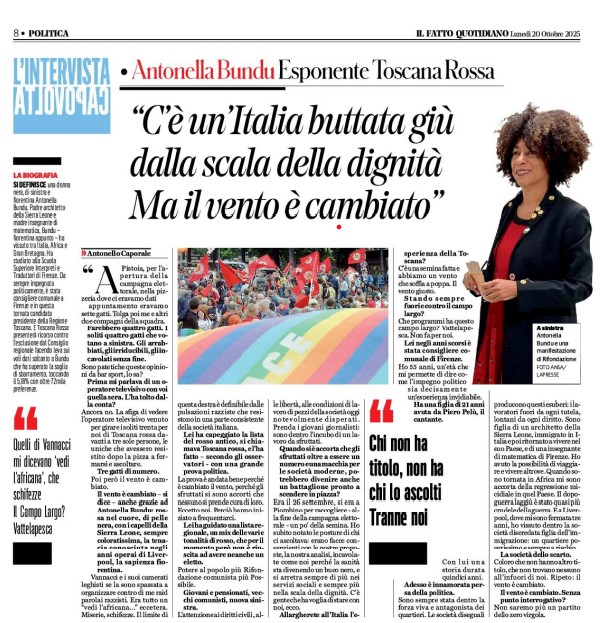 Intervista alla candidata Presidente di Toscana Rossa Domanda: Come prima domanda ti vorremmo chiedere la tua storia politica e non, per farti conoscere anche fuori dalla Toscana. Risposta: In alcune bolle dove vengo attaccata per il colore della mia pelle, ricostruiscono la mia biografia in modo curioso. Ricordano che sono nata a Firenze, che mio … Leggi tutto
