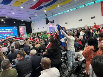 “La vicepresidente Rodríguez Gómez arriva in ritardo, forse per le manifestazioni qua fuori – prende la parola rivolgendosi alla classe popolare, agli indigeni, ai politici e ai giovani. Chiede di creare un movimento popolare mondiale, capace di contrastare fascismo, colonialismo e imperialismo, e di denunciare le ingiustizie, come il massacro del popolo palestinese. Invita a lottare contro le organizzazioni fasciste in tutto il mondo, dall’Europa all’America Latina. Sottolinea l’esempio del popolo cubano, che ha resistito con dignità e coraggio attraverso la rivoluzione.